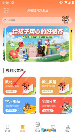 2、在商城页,选择【教材】分类进入教材列表页。