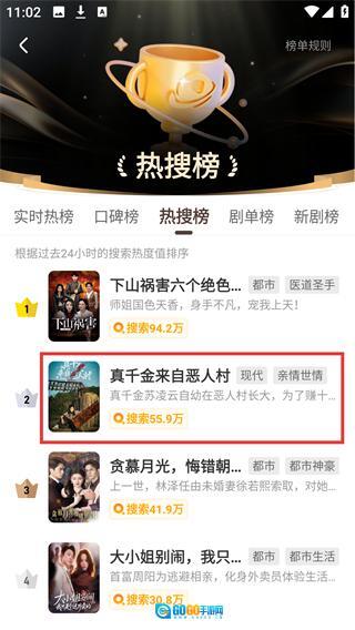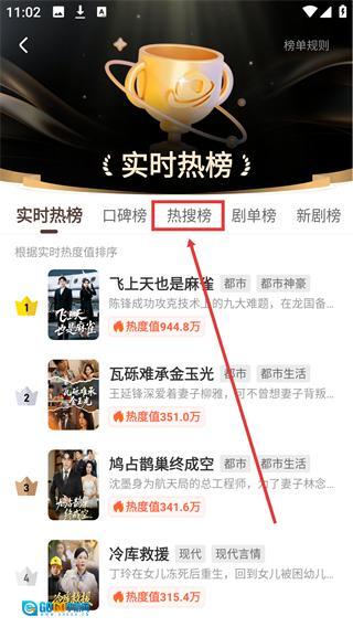 进入榜单页面后,点击【热搜榜】选项卡,切换到热搜榜视图,就能查看24小时内搜索热度较高的剧集。