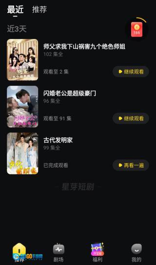 1、星芽短剧的观剧记录分别存储在“最近”和“历史”这两个版块中。