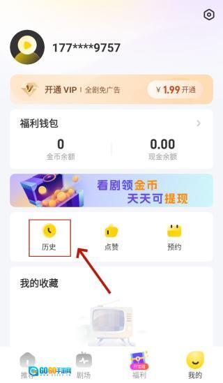 3、需先完成手机号登录操作,随后点击“历史”选项,进入“观看历史”界面。