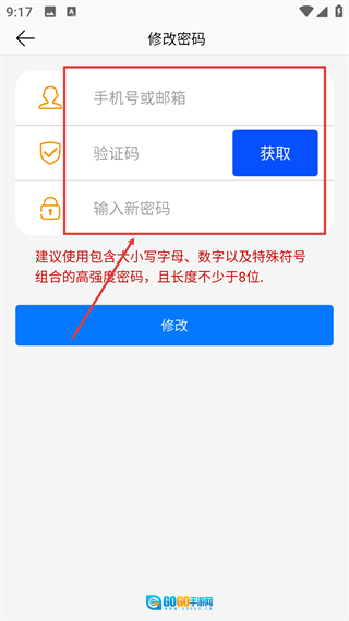 3、请按顺序填写【手机号或邮箱】、【验证码】以及【新密码】这三项内容。