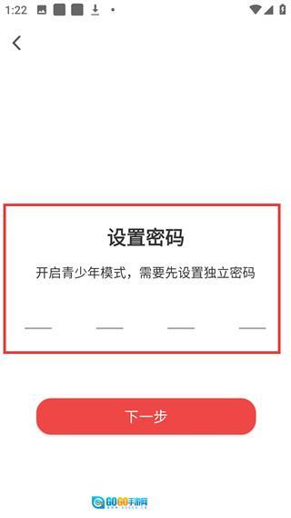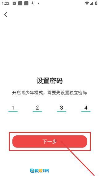 4、在“设置密码”页面,输入4位独立密码后,点击“下一步”按钮,就能继续完成青少年模式的开启配置流程。