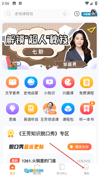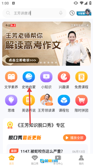 1、打开后,在首页找到并点击【史地启蒙】选项,即可进入史地课程列表页面。