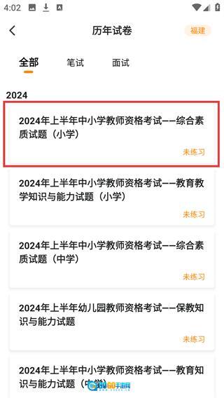 2、进入【历年试卷】页面后,找到【2024年上半年中小学教师资格考试--综合素质试题(小学)】这一条目,点击该条目即可进入答题页面。