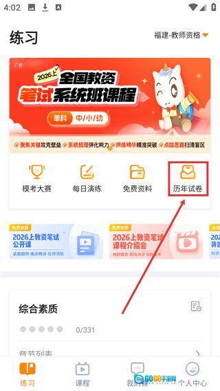 1、在【练习】页面的功能入口中,找到并点击【历年试卷】选项,即可进入相应板块查看各类考试试卷。