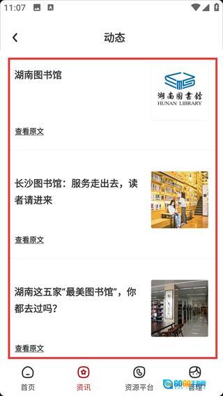 4、在【资讯】对应的动态页面,能看到【湖南图书馆】【长沙图书馆】等发布的内容,点击【查看原文】可了解详细信息。