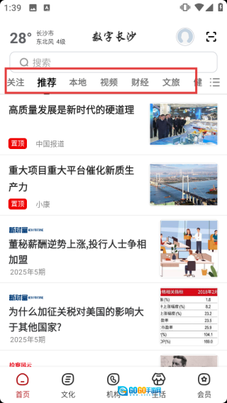 1、打开“数字长沙”,在首页可通过【关注】【推荐】【本地】【视频】【财经】【文旅】等频道标签,浏览各类新闻资讯。