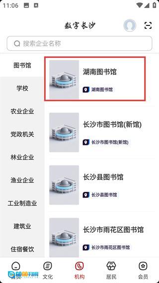 2、进入【机构】板块后,可搜索企业名称,能看到【湖南图书馆】【长沙市图书馆(新馆)】等机构选项,点击对应机构即可进入。