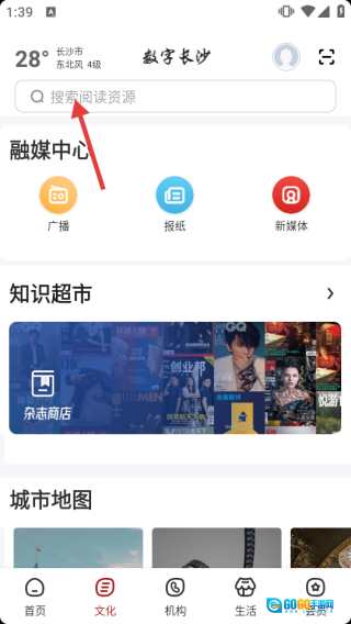 2、在文化页面顶部搜索栏输入关键词,可搜索阅读资源,也可通过【融媒中心】【知识超市】【城市地图】等板块获取相关文化信息。