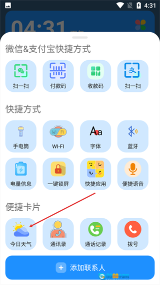2、进入功能选择页面后,在“便捷卡片”区域找到“今日天气”选项并点击它。