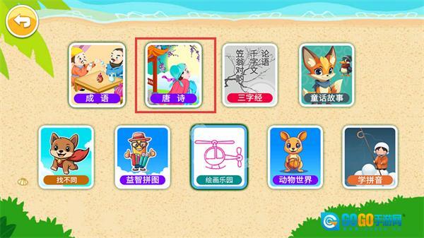 2、进入【知识乐园】页面,点击【唐诗】选项可进入唐诗学习的内容列表页。