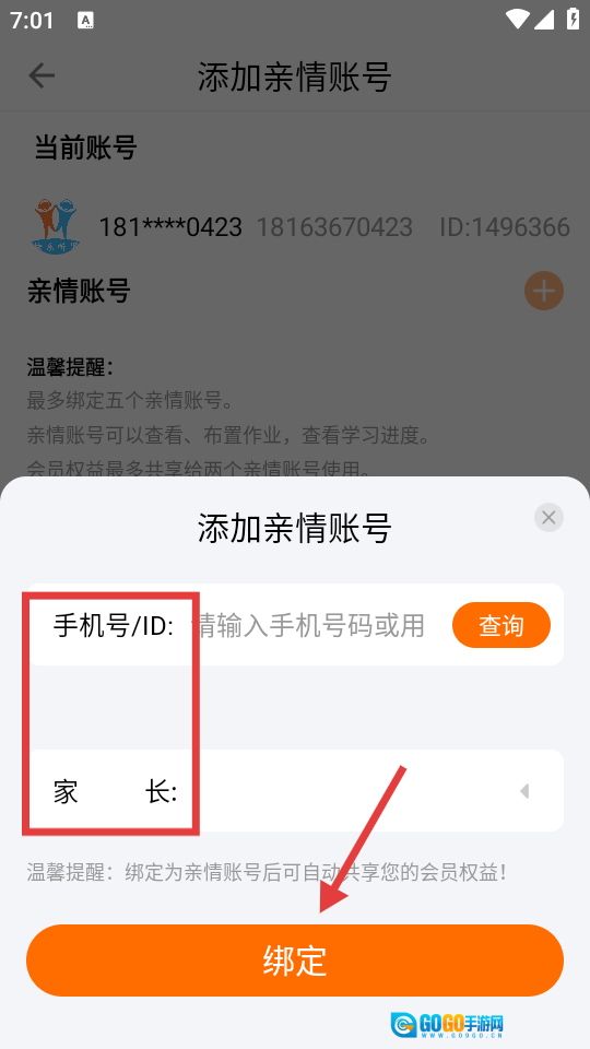 4、最后输入相关信息,点击【绑定】,完成亲情账号添加。