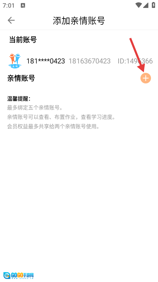 3、在【添加亲情账号】页面,点【+】号进入下一步。