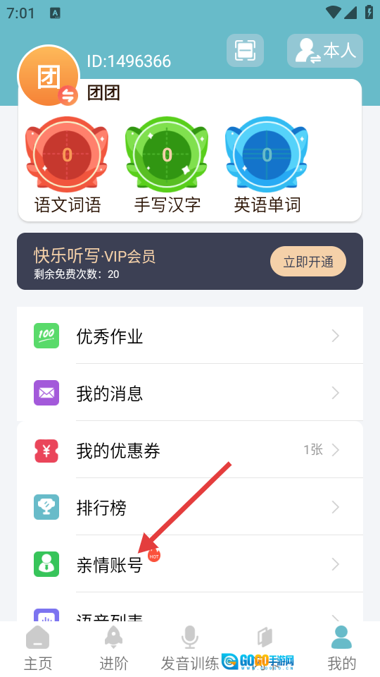 2、在【我的】页面,点【亲情账号】,进入亲情账号设置页面。