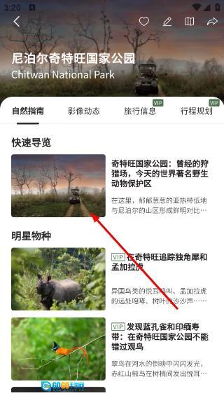 4、进入【尼泊尔奇特旺国家公园】详情页,可查看【快速导览】-【明星物种】等板块内容,了解该地点的自然指南信息。