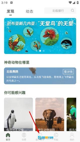 1、在【发现】页面可查看如巴布亚新几内亚-“天堂鸟”的天堂这类内容,还能了解【北极燕鸥】信息,以及“你可能感兴趣”板块的推荐。