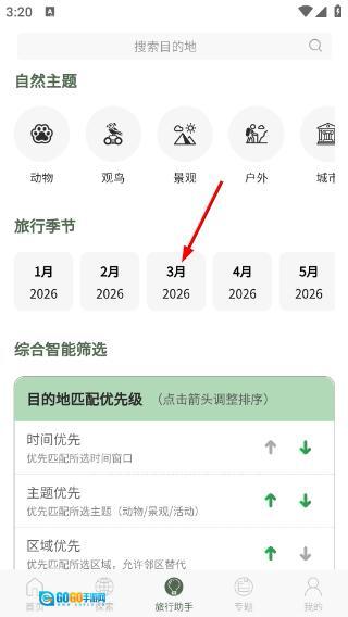 2、进入相关页面后,选择【自然主题】下的分类,选定【3月-2026】旅行季节,还能通过综合智能筛选调整目的地优先级。