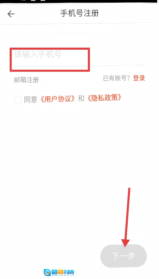 4、在【手机号注册】页面,输入手机号后,点击【下一步】按钮继续注册。