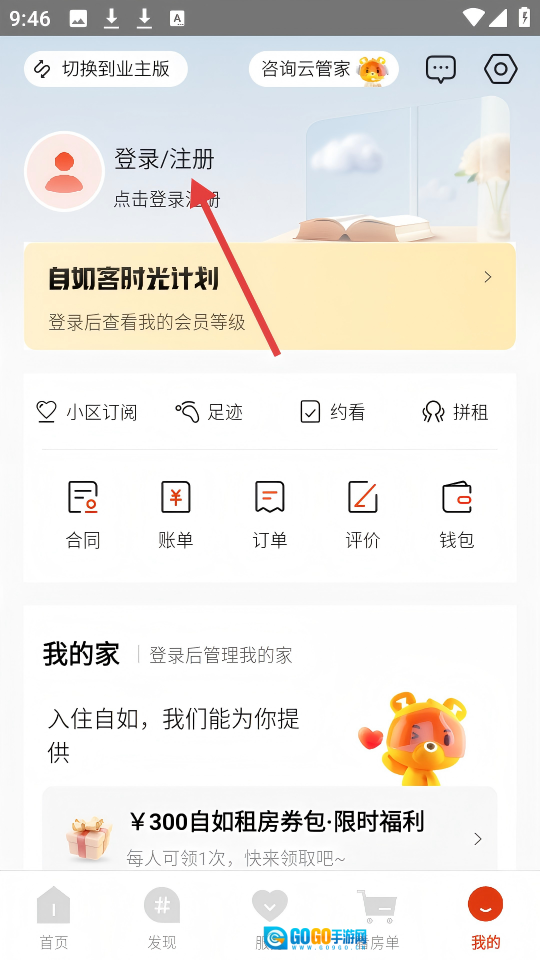 2、在【我的】页面,点击【登录/注册】按钮,进入登录注册界面。