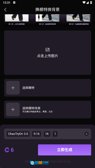 3、进入更换背景的页面后,先上传所需图片,接着挑选合适的模特,添加对应的模特场景,之后执行生成操作。