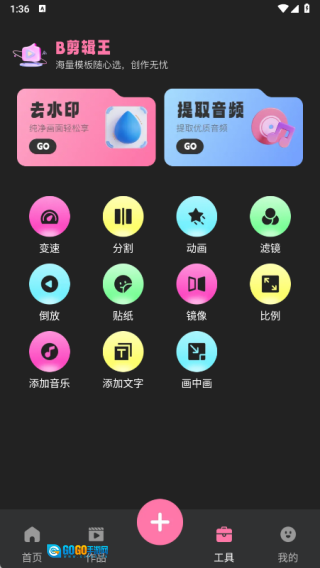 4、工具页面整合了去水印、提取音频功能,同时还提供变速、分割、动画、滤镜等实用工具。