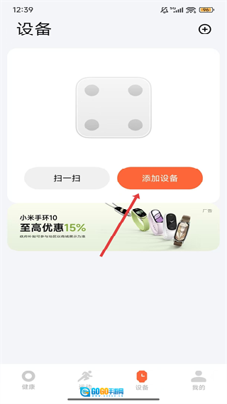2. 开启手机蓝牙功能后,把设备移至手机附近,等手机蓝牙扫描到该设备,接着在运动健康应用的设备界面中点击“添加设备”选项,即可完成配对与连接操作。