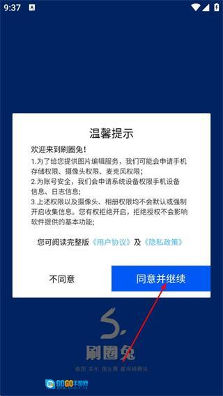 1、在温馨提示弹窗里,点击“同意并继续”按钮,即可进入刷圈免应用页面。