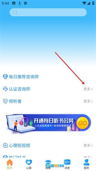 1、打开“每日心理”应用,在首页找到“认证咨询师”板块,点击其右侧的“更多”按钮,即可进入咨询师列表页面。