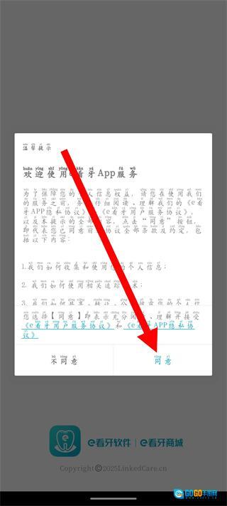 1、打开e看牙,在温馨提示弹窗中,点击同意。