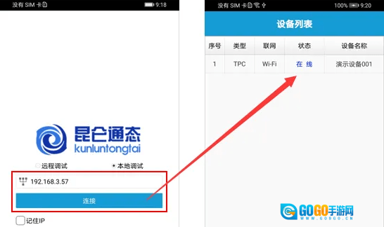 如下图所示,在手机端启动MCGS调试助手后,选择“本地调试”选项,接着输入触摸屏WiFi网卡的IP地址,随后点击“连接”按钮,系统便会展示出设备列表。