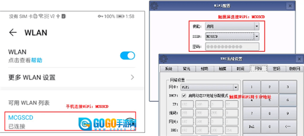 手机与触摸屏借助WiFi接入同一台路由器,具体连接情况可参考下图,二者连接的是相同的WiFi网络,其中触摸屏WiFi网卡的IP地址为192.168.3.57。