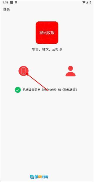 1、进入稳讯收银点击手机图标,进入短信登录页面。