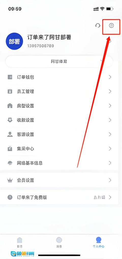 1、首先打开手机端的订单来了应用,要是已经登录了账号,就在【个人中心】里点击齿轮形状的设置图标。
