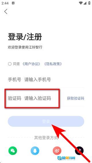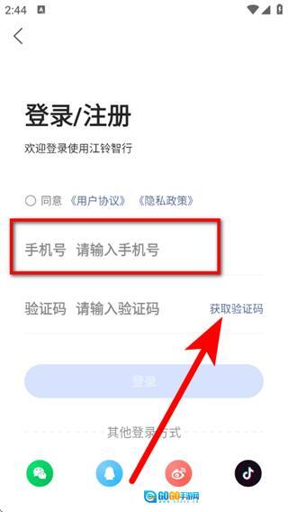 3、在登录注册页面,输入手机号,点击获取验证码。