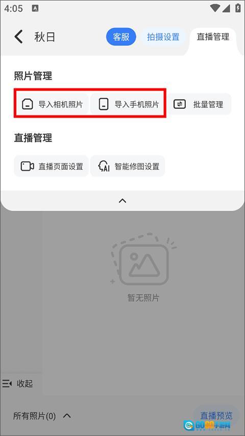 4、在直播管理界面,选择导入相机照片或手机本地照片;
