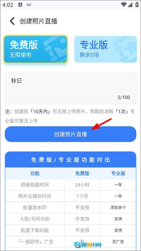 2、打开创建页面,可选免费版或专业版功能,输入照片直播标题后点击创建;