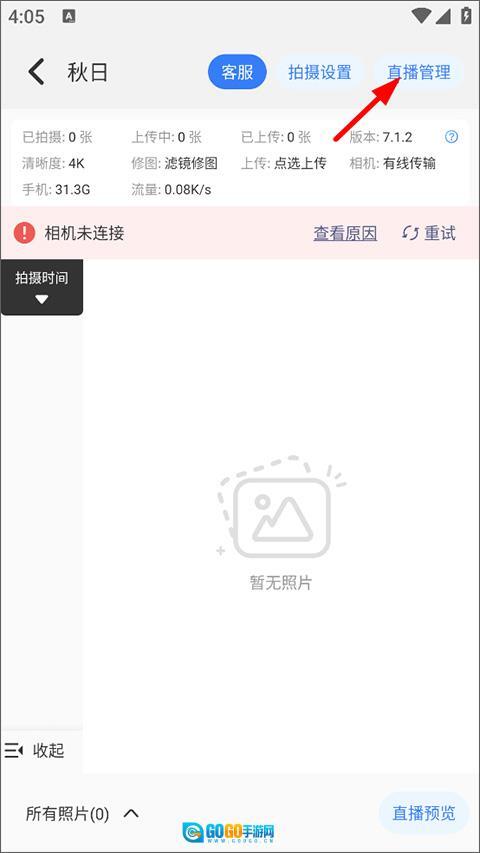 3、进入空白照片直播页面,可进行拍摄设置与直播管理,点击直播管理选项;