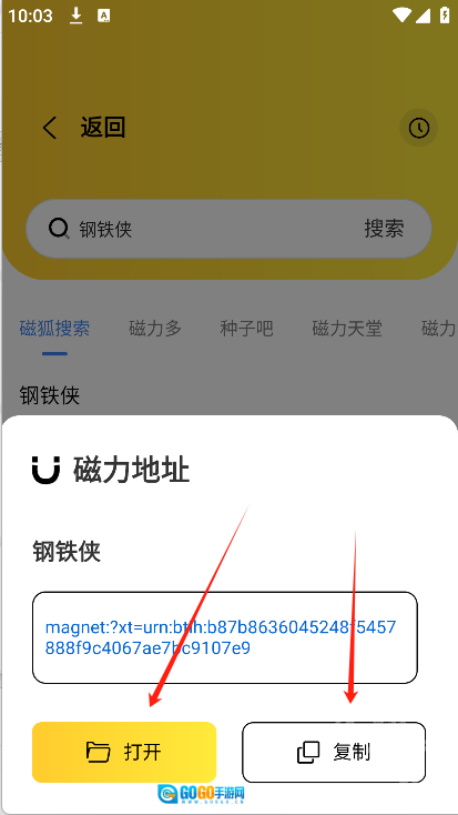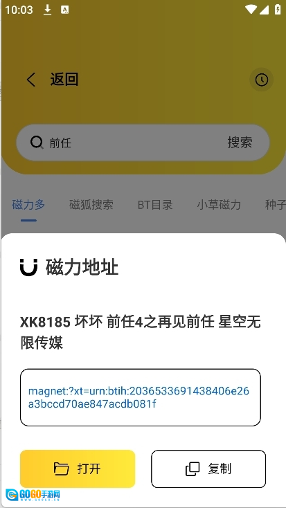 7、点击对应的磁力链接后,您可选择打开该链接或复制其内容。