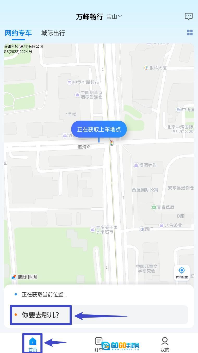 3.返回首页后,系统将自动定位当前所在位置,请耐心等待上车点信息加载完毕。