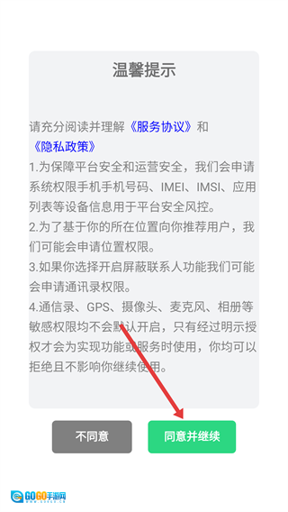 1、仔细阅读《服务协议》和《隐私政策》的相关条款,确认无误后点击【同意并继续】按钮,即可进入应用的功能操作界面。