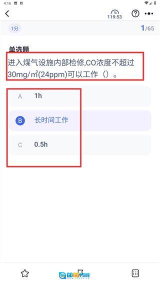 4、在答题界面中,若遇到单选题(例如涉及煤气设施检修时CO浓度的题目),只需选择对应的选项(比如B选项)来完成该题作答,以此推动考试流程继续进行。