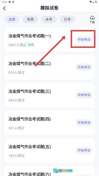 2、在模拟试卷列表中,找到【冶金煤气作业考试题(一)】,点击其右侧的【开始考试】按钮,即可进入试卷详情界面。