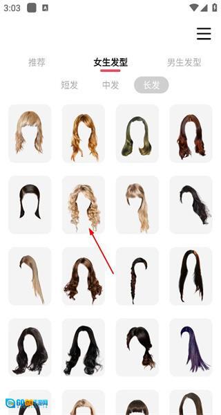 3、切换到女生发型里的长发类别,浏览各种各样的长发样式,看看不同卷度和颜色的长发展示效果。