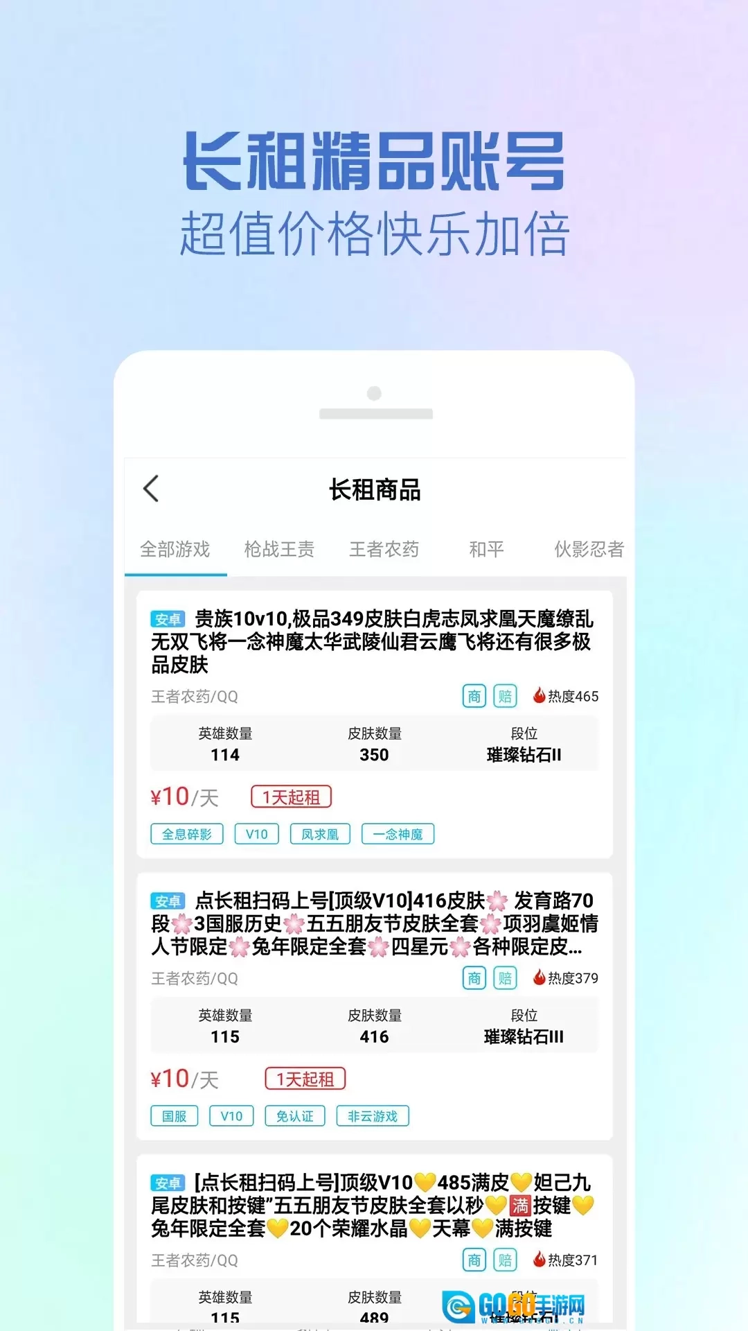 1、提供热门的游戏账号租用信息;