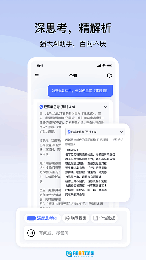 个知是每日互动推出的基于DS模型构建的AI全能辅助软件,具备多种深度思考的模型模式,能帮助用户轻松应对各类复杂问题;同时它打造了个人知识库与大模型问答模式,让用户可便捷地将个人笔记和行业情报存入知识库使用。