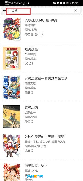 2、进入动漫之家网站,在搜索栏输入漫画名称(例如炎拳),接着在下方显示的所有搜索漫画结果里点击“炎拳”这一项。