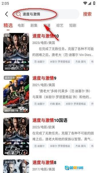 比如搜索“速度与激情”,页面就会展示相关的影视作品,像图中呈现的那样,点击你想观看的内容即可。
