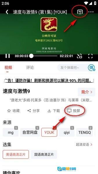 之后就会进入播放页面,你可以点击右上角的“TV”按钮,也可以点击页面中间的“投屏”按钮。