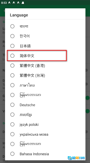 5、在语言列表里找到“中文”选项并点击选中,此时界面语言会马上切换成中文。