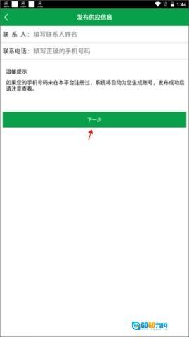 2、接着进行报价发布操作,依次填写企业名称、个人姓名以及联系电话,之后点击下一步按钮。